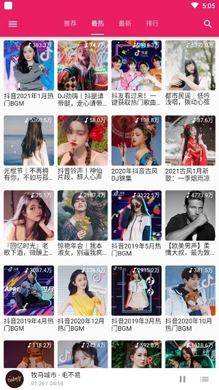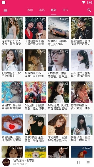 1、启动软件后,导航栏设有推荐、最热、最新、排行等专区选项,用户可进入相应专区挑选想要播放的音乐。