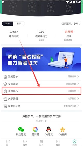 2、在【我的】页面中找到【设置中心】进入到设置里;