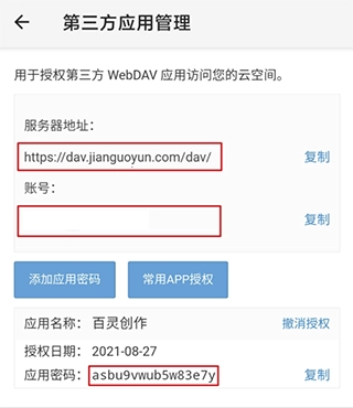 ●最后回到百灵创作,在WebDAV配置弹窗里对应的位置填写“服务器地址”“账号”和“应用密码”就可以了。