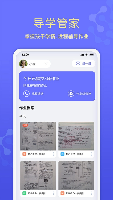 导学管家是导学号智能作业灯的配套家长端,同时也是一款针对学生群体设计开发的辅助软件。它功能丰富实用,能有效帮助家长监督孩子完成作业。首次登录软件首页,需要先完成护眼灯的绑定操作,绑定后才能进一步使用软件的各项功能。通过视频通话功能,孩子遇到的疑惑可以轻松得到解答;借助家长权限设置,能避免孩子抄袭答案;还能合理调节孩子的作业时间,让孩子充分发挥学习能力,避免过度劳累。觉得这款软件不错的家长朋友们,不妨赶紧来体验一下!