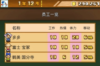 聊完盈利相关的部分,再说说员工配置的问题。在项目初期,也就是互动商店刚启动的时候,先招募八名员工,职业分布均衡即可。资金方面,初期给到的启动资金加上开店后赚的钱,用来招这八个人是足够的。招募的同时,要给每个员工各打造一件提升移动速度的装备。等所有移速装备都制作完成后,把员工的三维属性(大概是指某种综合能力指标)都练到二十点,然后晋升为E级员工。接下来,再给每个人各做一件能增加热情、工作效率或体力的装备,以最快的速度把他们的三维属性都提升到两百以上,这样就能在年底评选中拿到第一名了。