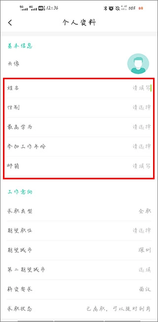3、用户填写完成相关信息后,可在“我的”板块中编辑个人求职意向,包括全职、兼职、期望行业等内容;