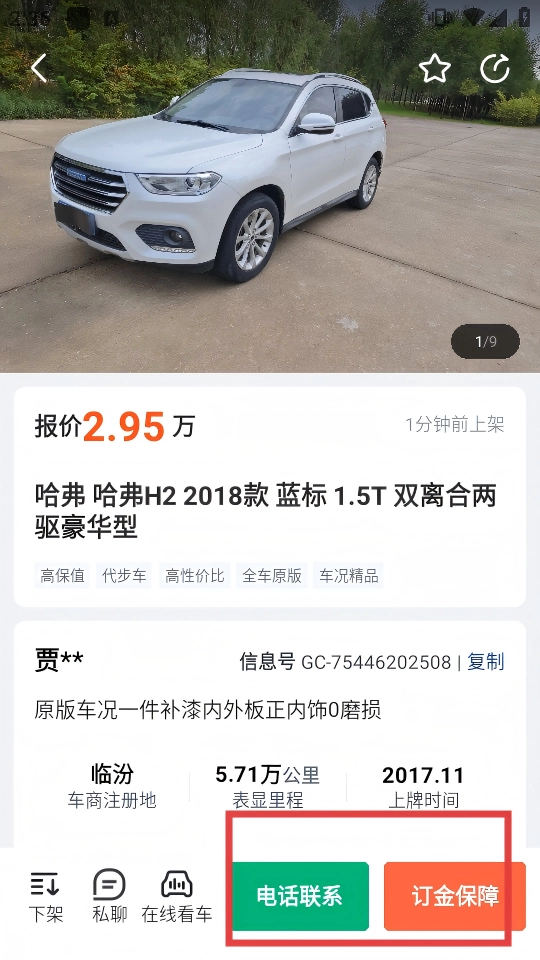 3、进入车辆详情页后,可点击【电话联系】与车主沟通,或选择【订金保障】保障交易。