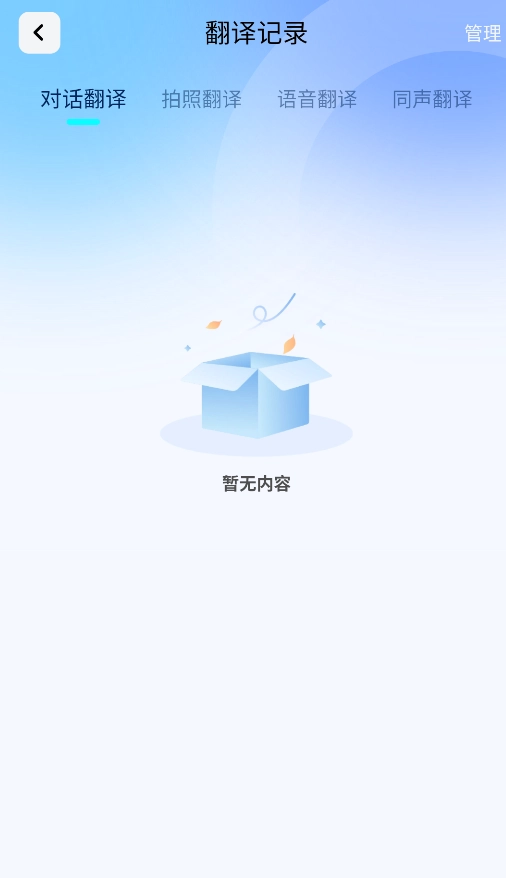 3.进入翻译历史页面后,能够查看以往的文本、语音、拍照以及实时对话翻译记录。