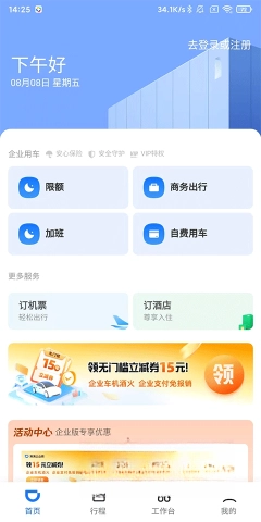 1、第一步是打开滴滴企业版App,其首页设有商务出行、加班、自费用车这三大核心功能板块,另外还包含机票与酒店的特色服务项目,服务覆盖十分全面!