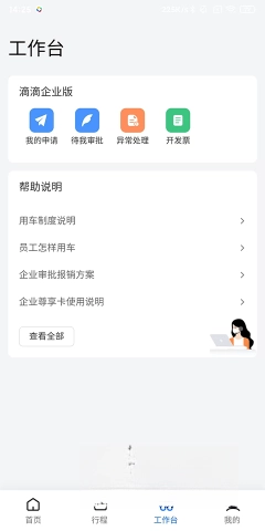 4、工作台上清晰展示着您的乘车记录、各类申请以及发票等服务内容,直观便捷,十分实用。
