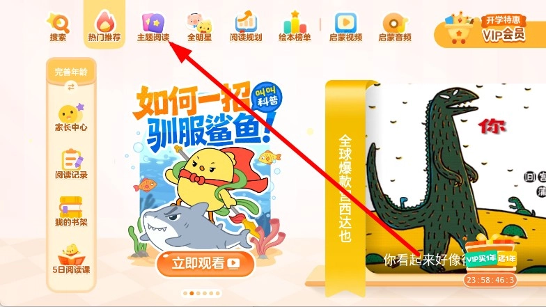 1、打开叫叫绘本,点击上方导航栏中的主题阅读。