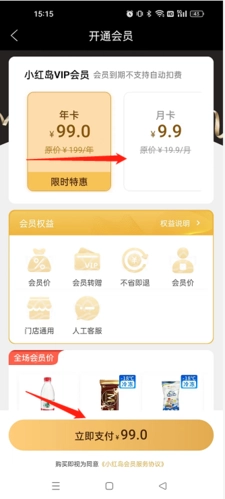 2、选择年卡或者月卡,点击“立即支付”选项即可。