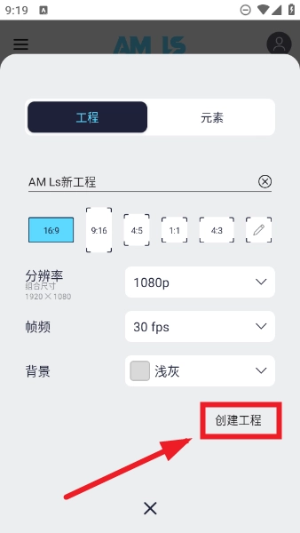 2、创建新工程时,我们能够对多项内容进行调整,像可以给新工程命名、设置画面比例、分辨率、帧数以及背景,所有调整完成后,点击界面最下方的“创建工程”按钮即可。