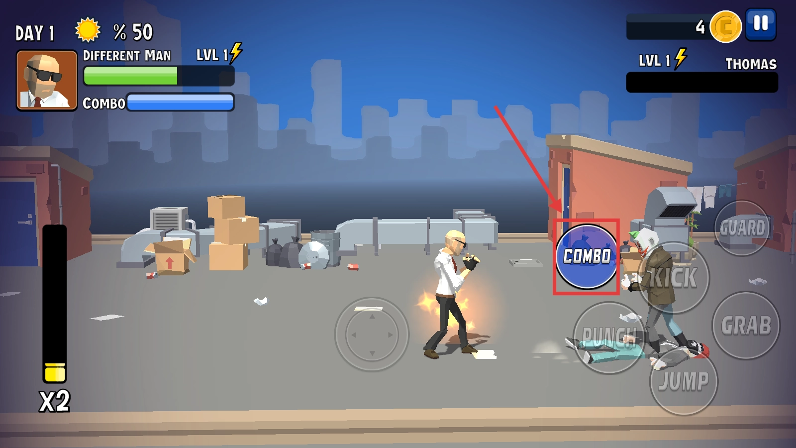1、在战斗时,我们点击右侧【PUNCH】、【KICK】等按键,组合攻击敌人,快速积攒连击呀。