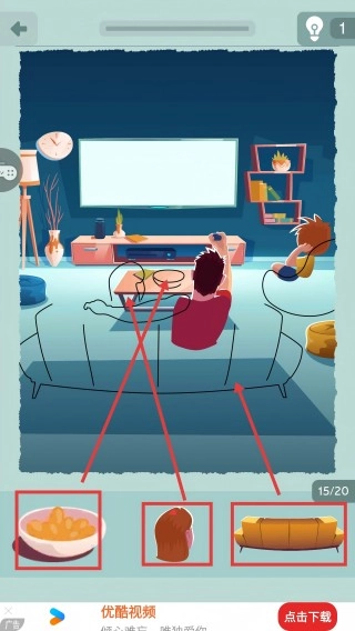 3、请依次拖动【沙发】【人物头部】【零食碗】这三个元素,分别将它们放置到客厅主体、左侧座位、茶几对应的位置上,以此还原出休闲场景原本的样子。