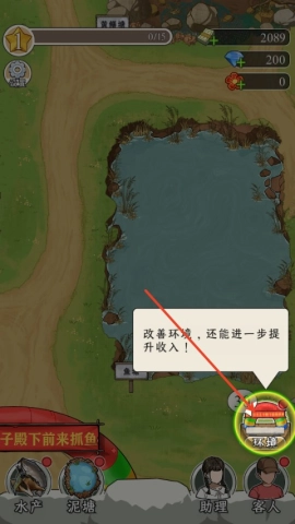1、游戏初始,你会得到一个小型池塘,通过宣传推广来招揽客人体验抓鱼项目,用赚取的收益升级鱼塘设施,解锁更多不同种类的水生生物,从而提升顾客的游玩体验。