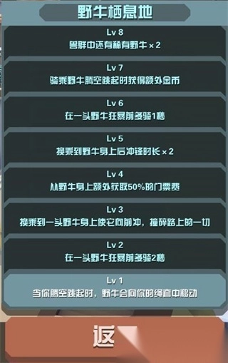 3、当前每种动物都配备了8个技能,拿野牛来说,Lv 1阶段,当你起跳时,地图里的其他野牛会朝着你的方向聚集,这能减少换乘过程中的失误概率;Lv 2可以延长在同一只野牛身上的骑乘时长,让野牛没那么容易进入狂暴状态;Lv 3能赋予野牛冲刺能力,在换乘瞬间拥有短暂的无敌效果……经过这些升级步骤后,野牛的实用价值会显著提升。