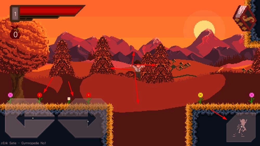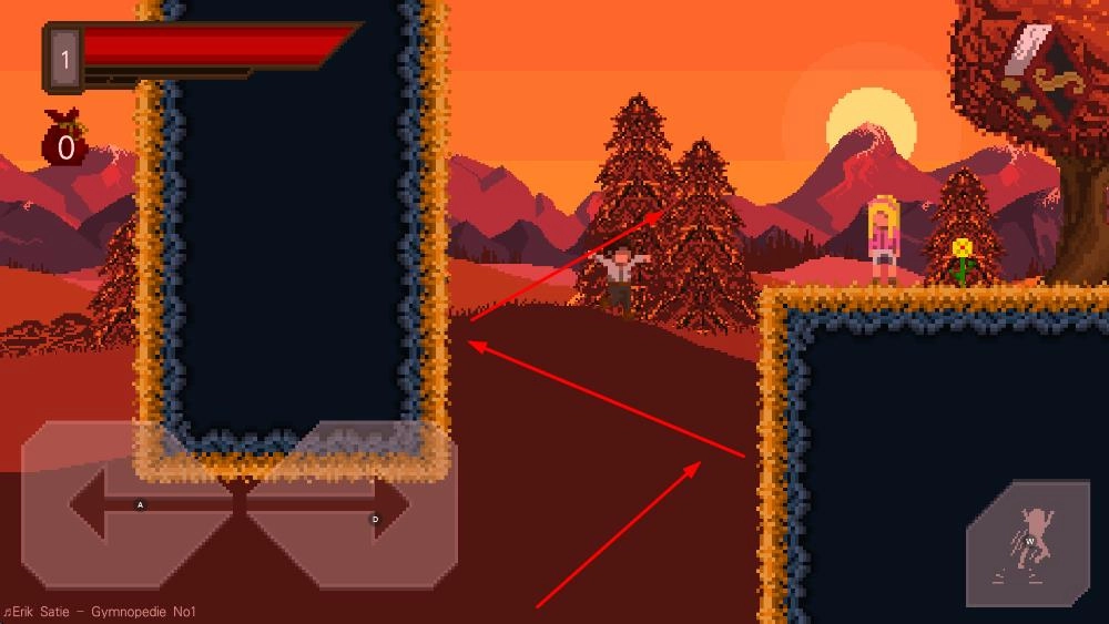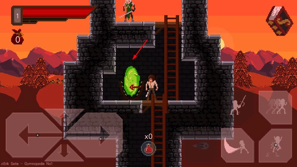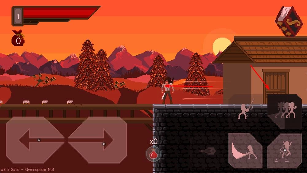 1、操控角色在像素风格的山川、建筑等场景中移动,通过左右方向键探索不同区域。