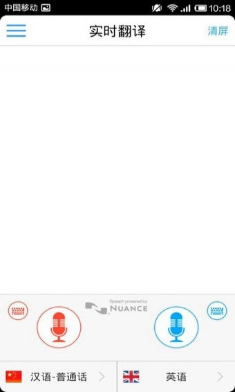进入首页后,页面设计十分简洁:下方有两个麦克风图标,上方是记录屏区域;麦克风图标下方可选择输入语言,右侧则对应翻译目标语言——不过这两个语言选择功能其实存在一定程度的重复。