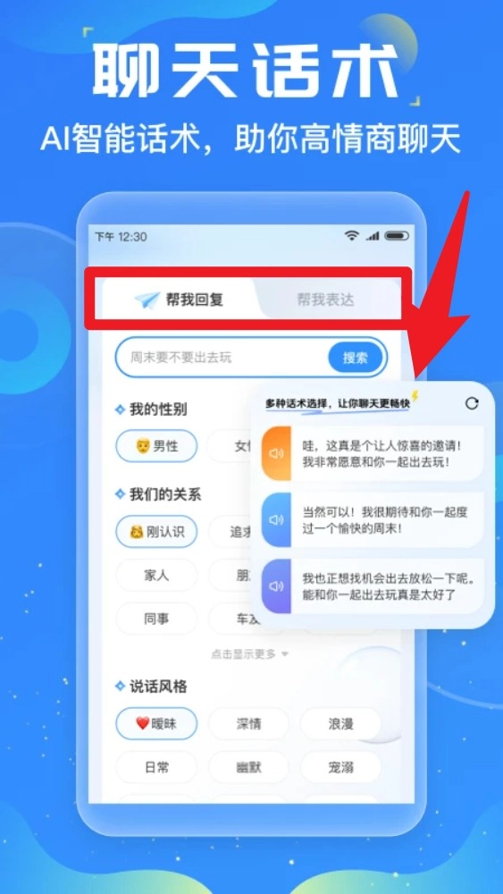 3. 点击聊天话术模块里的“帮我回复”标签,选定性别、关系和风格后,系统就会自动生成多种回复语句。