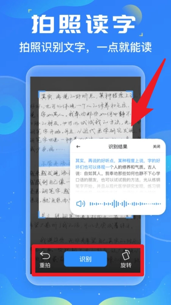 4. 进入拍照识字界面后,对纸质内容进行拍摄,点击识别按钮就能提取文字,同时还支持通过语音朗读来辅助理解。