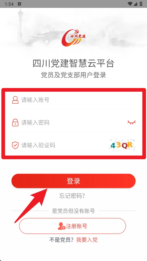 1、初次打开四川党建应用时,需在登录页面填写账号、密码与验证码,随后点击登录按钮进入平台;若尚未注册账号,可先完成账号注册操作。