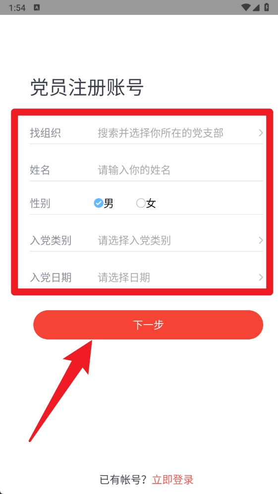 2、进入注册账号页面后,依次填写组织、姓名、性别、入党类别和入党日期等相关信息,随后点击“下一步”按钮,即可完成账号注册流程。