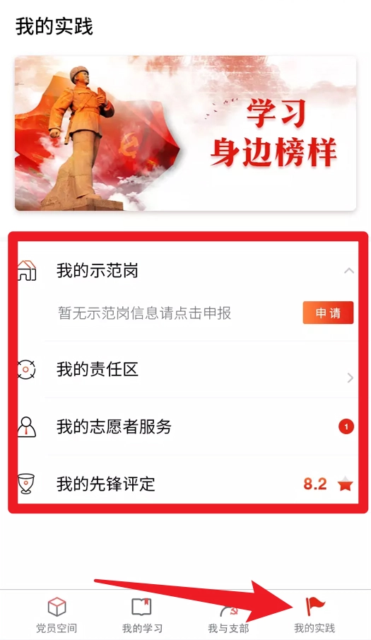 5、在我的实践模块里,能够开展示范岗申报、责任区查看、志愿者服务以及先锋评定等工作,对党员的实践活动进行全面记录。