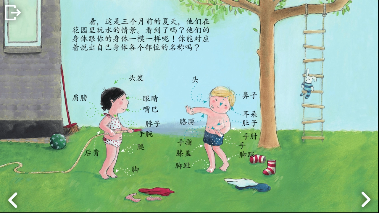 3、画面里有两个小人物正在交谈,大家可以通过他们的对话来认识身体的结构