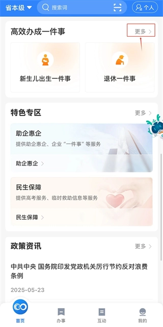 2、在主界面下拉找到【高效办成一件事】专区,点击【更多】选项