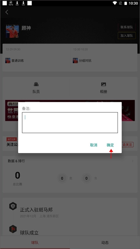5、在备注栏填写个人球技情况与具体信息,填写完成后点击确定按钮。后续会有队长审核你的申请信息,一旦申请通过,你就能加入球队了。