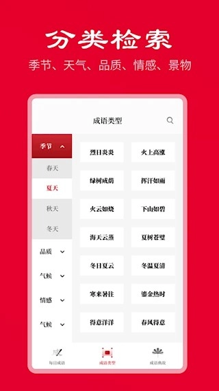 2、分类检索:从季节、情感、景物等多个维度对成语进行划分,搭建起清晰的分类体系,助力用户依据主题迅速找到目标内容。