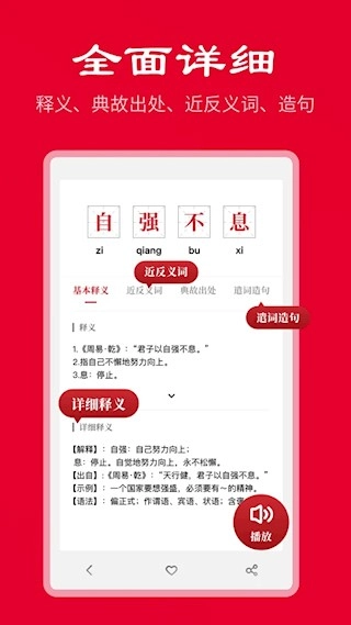 1、词库完备:涵盖古今各类成语,收录考纲核心条目,每条都附有拼音、释义、出处及近反义词等多方面内容。
