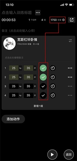 开始训练后,你就能挑选动作并开启记录了。每完成一组训练,就打勾一次,训记会依据你打勾的组数,自动计算训练容量。