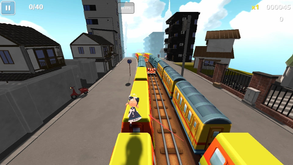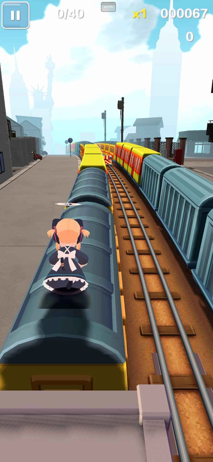 1、操控角色在列车间跑酷,注意躲避障碍,在轨道区域灵活移动。