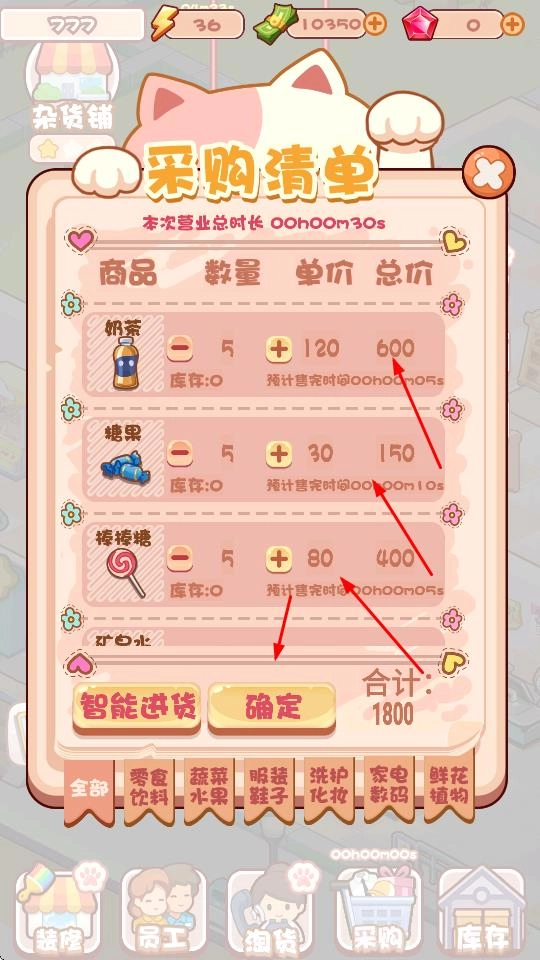 2、进入采购清单界面,选择奶茶、糖果、棒棒糖等商品,设置采购数量,点击确定完成进货,保障商品库存。
