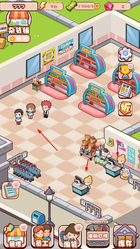 3、在店铺场景中,顾客会进入选购商品,收银员进行结算,通过装修、员工管理等提升店铺经营效果,吸引更多顾客。