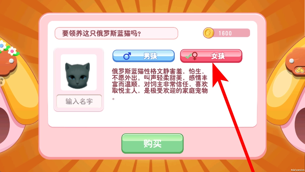 1、首先领养宠物,在界面中会出现宠物领养提示,选择宠物的性别等信息,点击购买,即可成功领养宠物,开启与宠物的养成之旅。
