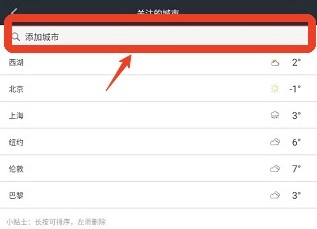 2、在其中找到“关注的城市”板块,接着在搜索栏中输入想要添加的城市名称。