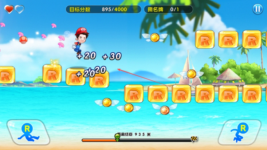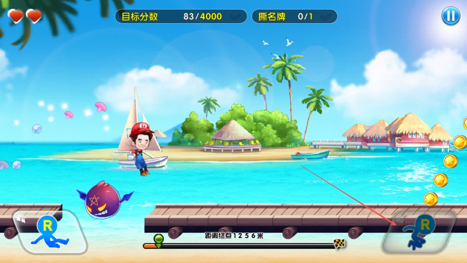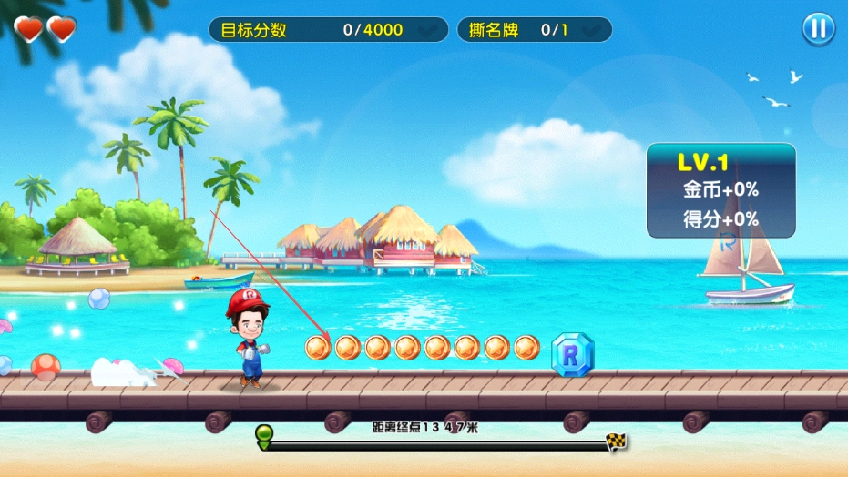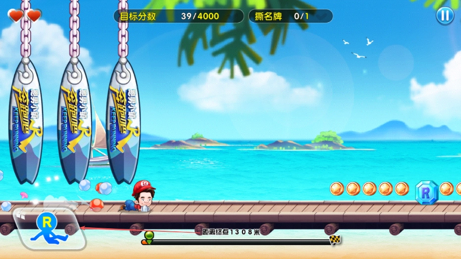 1、游戏开始留意目标分数0/4000和撕名牌0/1,操控角色收集木板路上的金币。