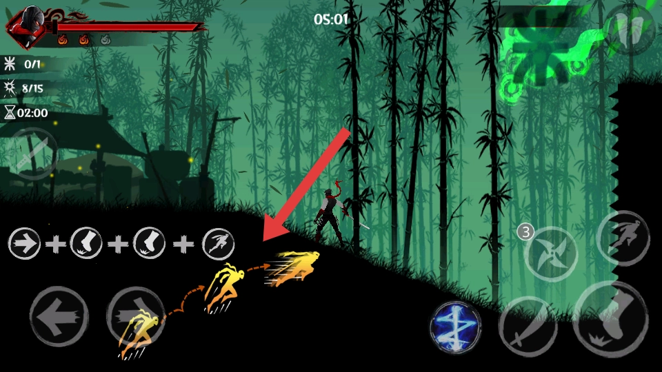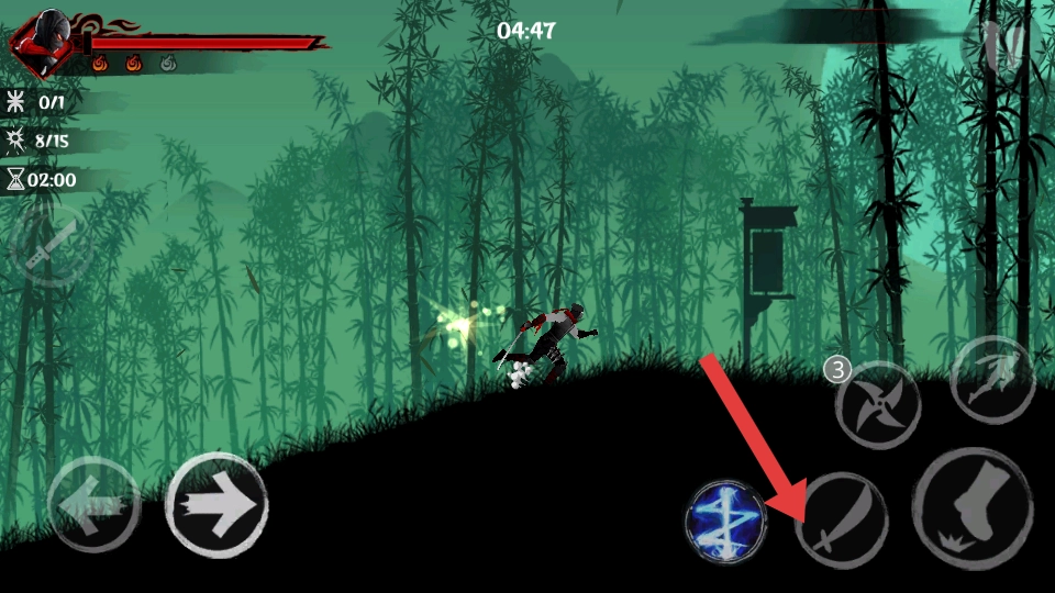 1、进入竹林场景后,利用左侧方向键灵活移动角色,躲避敌人从不同方向发起的攻击,可快速向左右移动,避开其下落攻击范围。