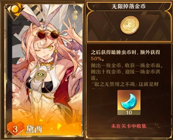 5、暴富之梦黛西: 【无限掉落金币】:个人非常推荐,特别是【暴富之梦黛西】有个回响能依据瞌睡虫币增加伤害,就算不选这个回响,也绝对是稳赚的。