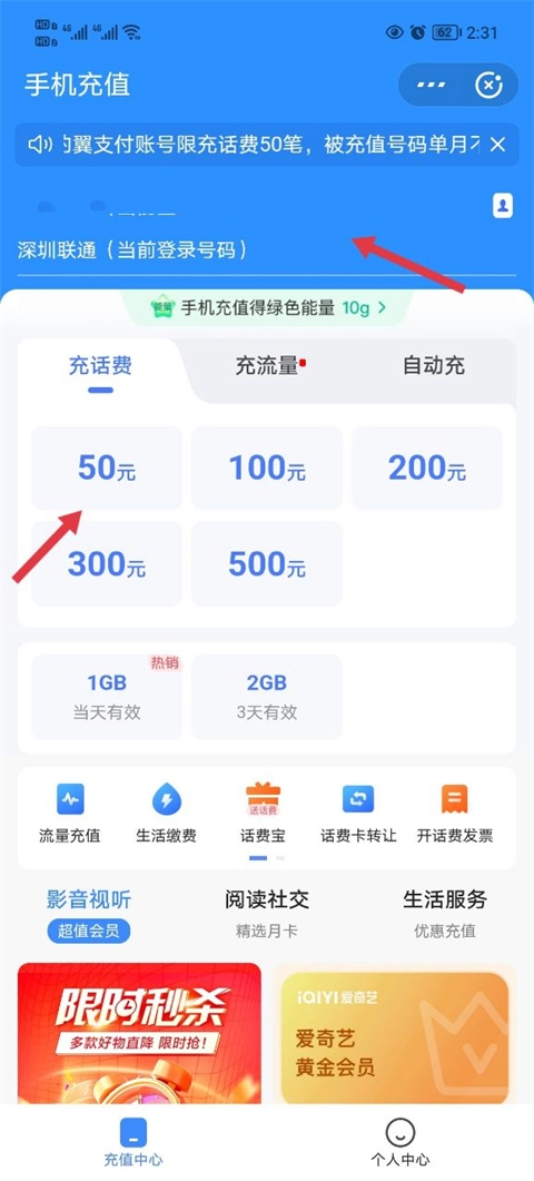 2、输入自己想要充值的电话号码,然后选择充值金额。