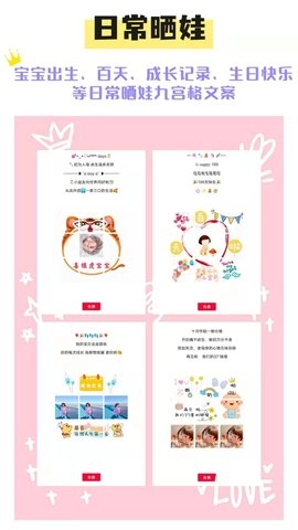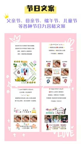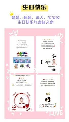 美图文案作为一款文案设计工具,为用户提供了丰富多样的精美九宫格图素材。无论是用于朋友圈分享、节日或生日祝福,还是日常晒娃、情人节表达爱意、美食推荐、萌宠记录、旅行见闻,亦或是情侣间的恩爱互动,这款软件都能精准契合用户的各类场景需求。它的出现帮助用户高效获取所需素材,为朋友圈内容增添创意与生机,使其告别单调乏味的状态。