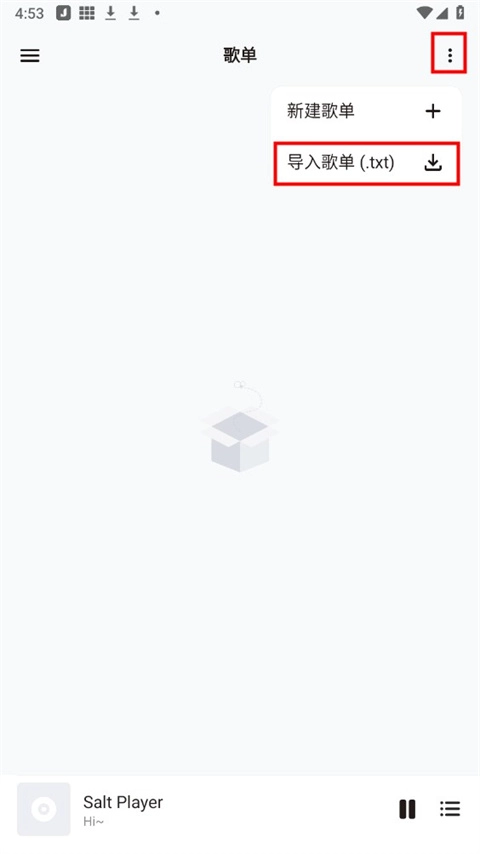 3、点击右上角的三点图标,选择“导入歌单”;