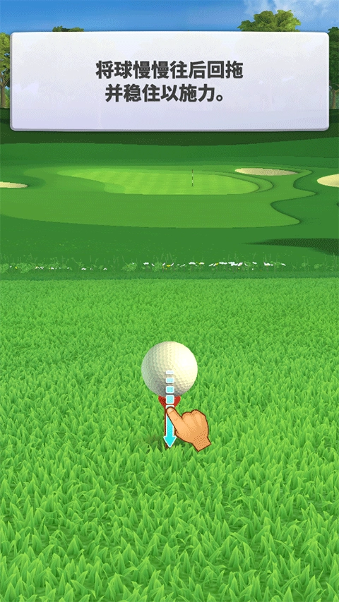 4、当球距离洞口较近时,只需把球向后拖动,让蓝色箭头对准洞口后释放就行;要是球离洞口很远,那就重复上一个步骤再击打一次球。