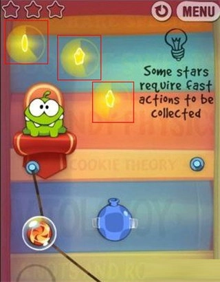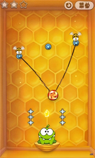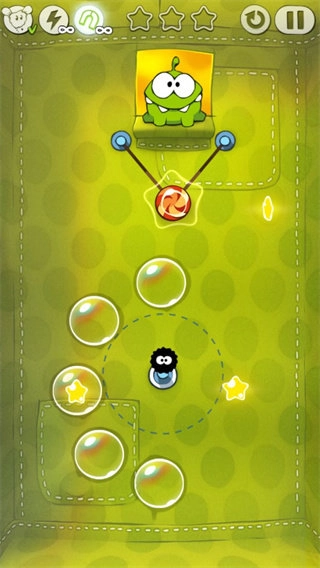 2、泡泡,糖果碰到泡泡的时候会上升,用手指点击泡泡使其破掉,当然了,当糖果飘出屏幕或者掉落出边界游戏就结束了。