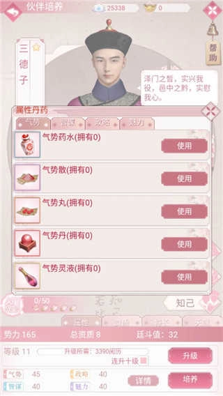 每个伙伴的资料里都清楚标注了他们的主要属性,给他们喂和主属性对应的丹药,能有效地增强他们的战斗力。要是你只专注提升某一个伙伴的属性,或许能更轻松地闯过关卡,不过在宫斗的时候很可能会碰到比较大的困难,所以最好还是均衡地提升各个伙伴的属性。