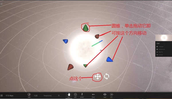 当你添加了多个物体后,若想调整它们的间距与位置,可点击add按钮左侧的edit按钮,这便是用于移动物体位置的功能选项。选中需要移动的物体,按住鼠标左键拖动该物体,即可在平面内对其进行移动操作。要是想调节星体的自转轴,只需单击并拖动物体的自转轴即可实现。
