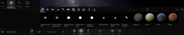 屏幕左下角设有Still、Orbit、Binary、Launch四种模式,可用于调整已添加星体之间的运行机制。处于Still模式时,所有添加的物体最终都会发生碰撞,但此模式下无法调节碰撞速度,碰撞角度也难以控制,系统会自动选定撞击目标与方向。