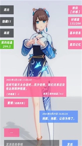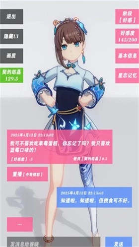 3、要是聊到对方感兴趣的话题,好感度最多能增加3点,在结晶用完之前就能达到比较高的好感度等级。还可以点击观赏功能,欣赏女主各种各样的卖萌动作。