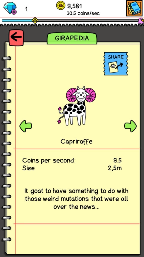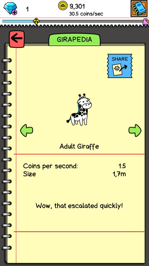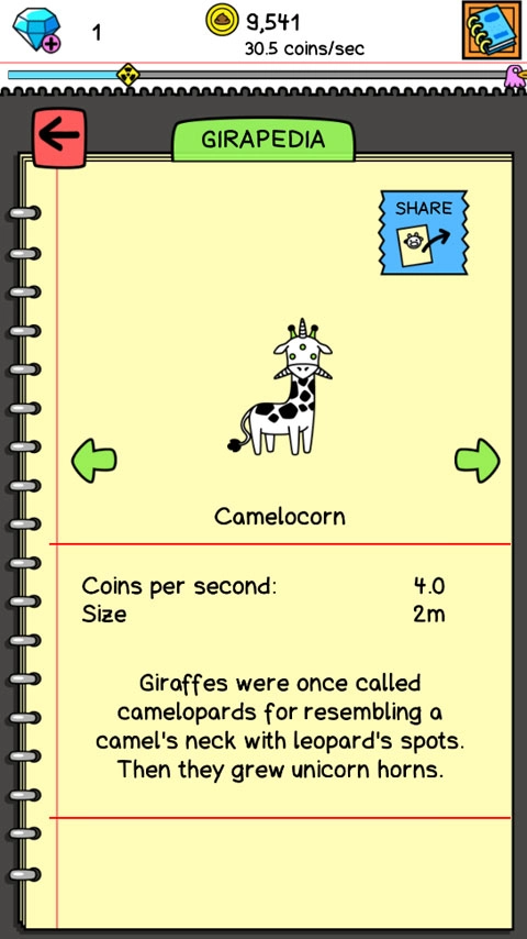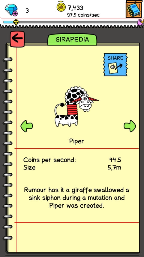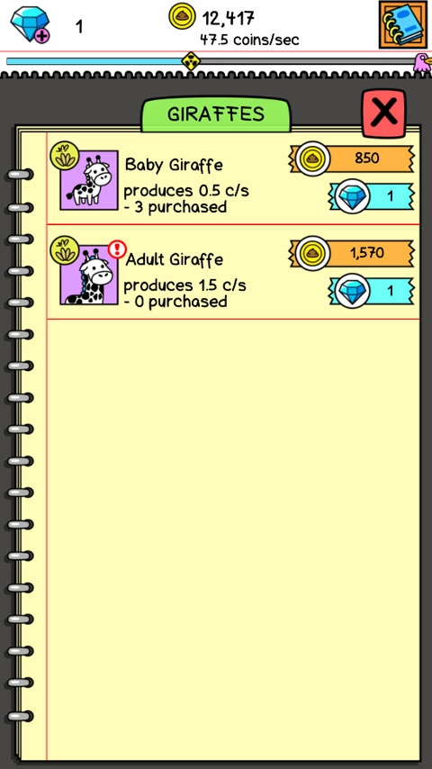3、把两只长颈鹿合并成一只新的长颈鹿,不同类型的长颈鹿产出的金币数量存在明显差异。