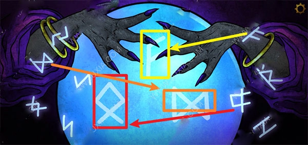 2、醒来后出现在柜子里,一直往右走,出现紫衣女人,对话后将对应符号挪到魔法球上,进入以下情景,红框处拿起金针。