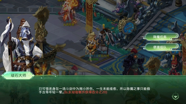 和好友组队参加降魔任务可以获取大量经验,并且有几率获得厉魔录、天魔录、环装以及领队英雄的额外经验加成。